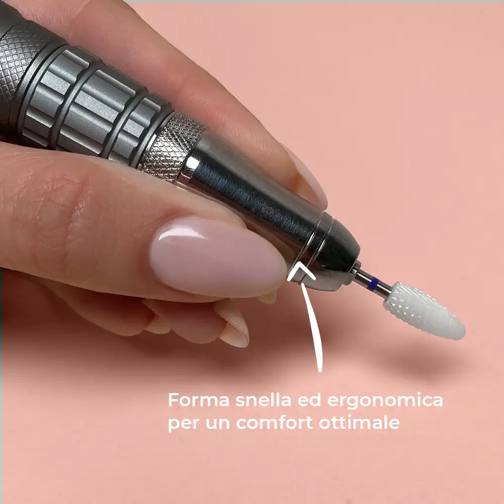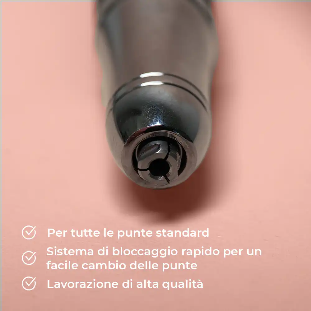 Fondamentalmente tutte le nostre punte si adattano a questo manipolo. Tuttavia, per ottenere risultati ottimali, è necessario adattare la punta della fresa al materiale e all’area di lavoro. Nella nostra gamma troverete punte speciali per rimuovere le cuticole , rimuovere lo smalto gel e punte più forti per gel e acrilico .