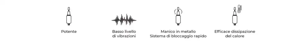 Grazie alla forma molto sottile ed ergonomica del manipolo è estremamente facile da tenere in mano. La punta è conica e presenta apposite scanalature per evitare scivolamenti.
