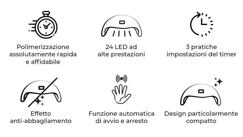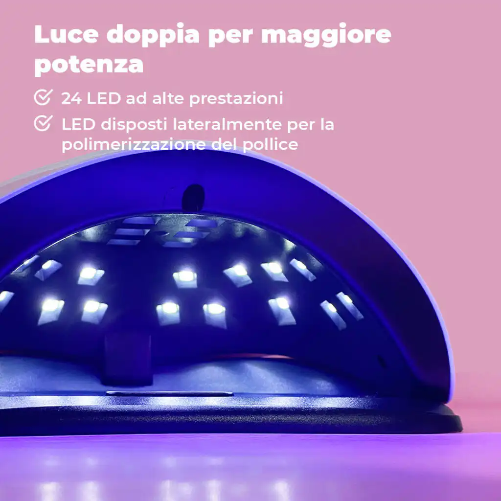 La più moderna tecnologia a doppia luce con 24 LED ad alte prestazioni posizionati in modo ottimale garantisce una polimerizzazione rapida e assolutamente affidabile dei vostri smalti gel e gel. Grazie ai LED disposti lateralmente, anche il pollice si indurisce facilmente.