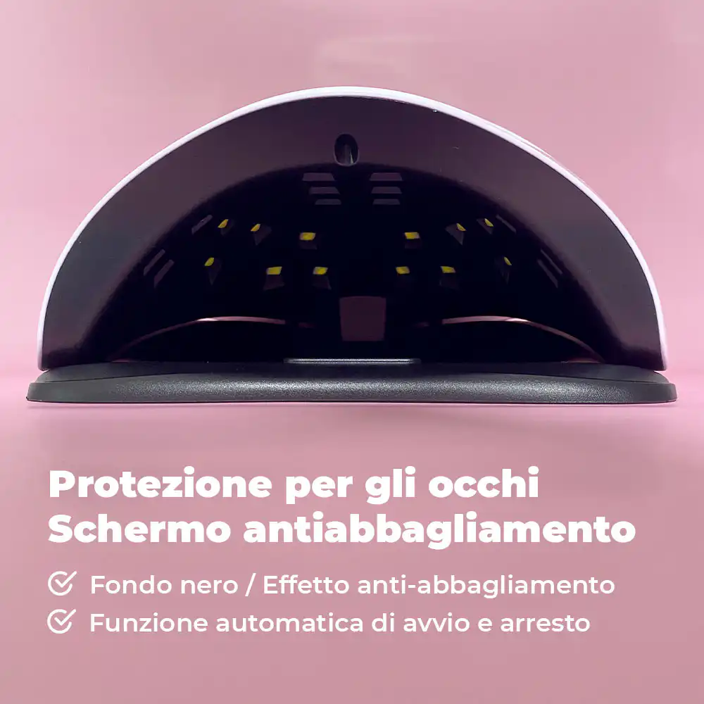 Per proteggere gli occhi, l’interno di questa lampada UV/LED è rifinito in nero opaco. Questo minimizza l’abbagliamento della luce e rende l’applicazione più piacevole. La cosa migliore? Nonostante la protezione antiriflesso, puoi goderti una polimerizzazione affidabile.