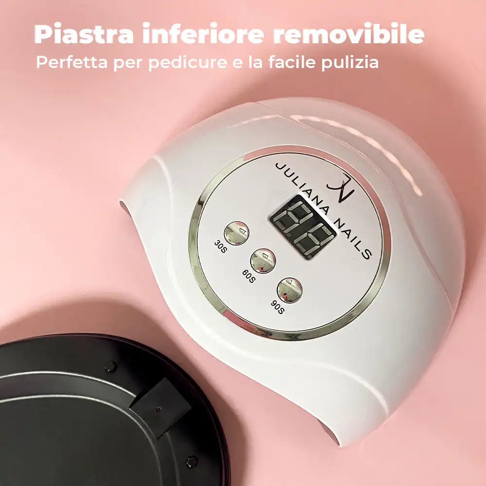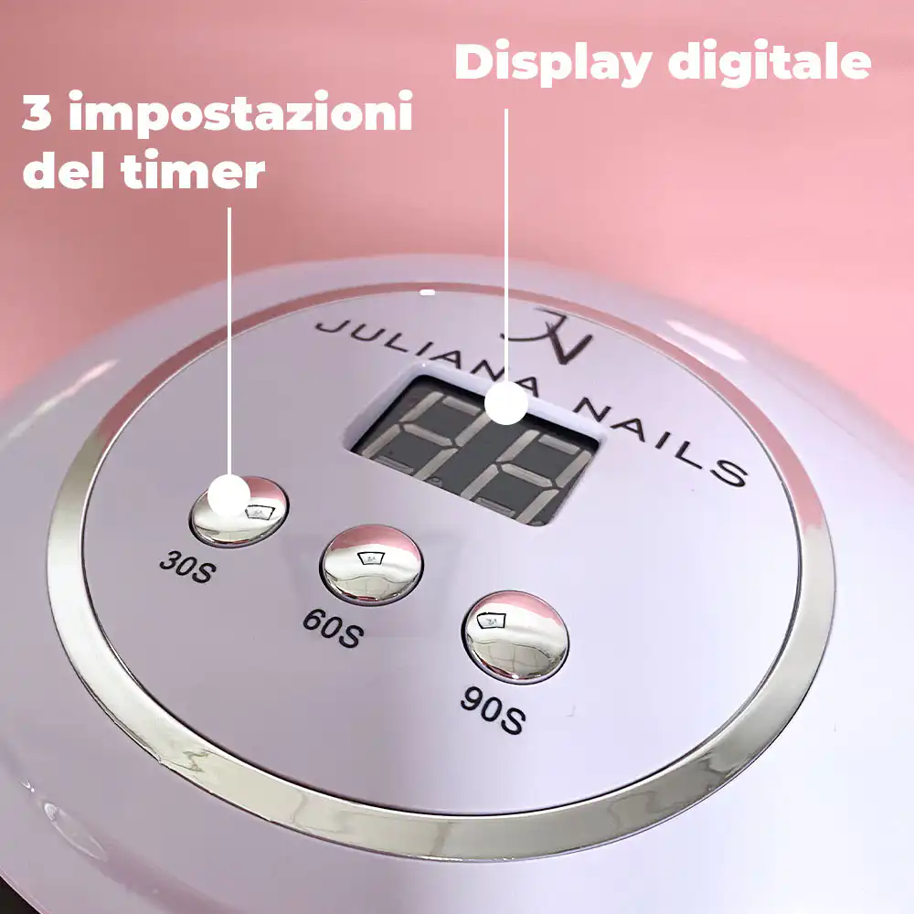 Con i 3 livelli di timer (30s, 60s, 90s) puoi scegliere ogni volta il tempo di polimerizzazione giusto per il tuo prodotto semplicemente premendo un pulsante, senza dover guardare l’orologio. Inoltre, questa lampada UV LED dispone di una funzione start-stop automatica che viene attivata da un sensore di movimento: Mano in mano – luce accesa. Il display digitale del timer ti assicura di tenere sempre d’occhio l’ora.