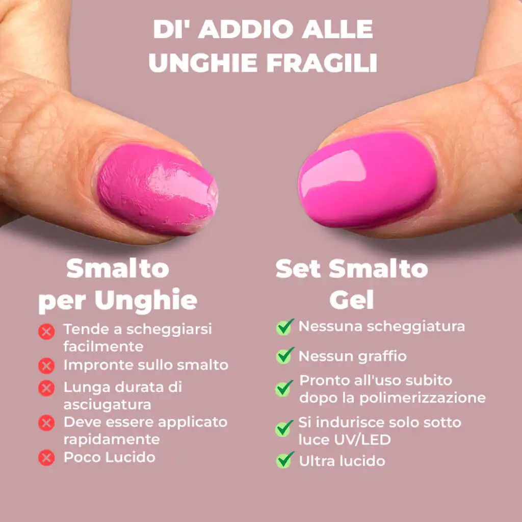 Conosciamo bene il problema: scheggiature e graffi degli smalti tradizionali. Con il nostro set di smalti gel, questi inconvenienti sono solo un ricordo! Meriti unghie che resistano a tutto, accompagnandoti ogni giorno senza mai rovinarsi. Che tu stia lavorando, cucinando o facendo sport, le tue unghie saranno sempre impeccabili.