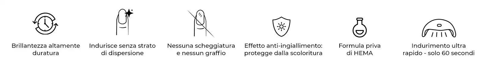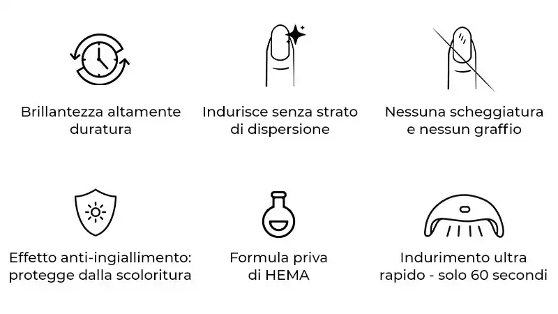 A differenza dei finish classici senza strato di dispersione, i pori di questo finish si chiudono subito dopo l’indurimento. Ciò significa che puoi toccare le tue unghie subito dopo che si sono indurite e applicare la tua cura. Niente può offuscare lo splendore mozzafiato.