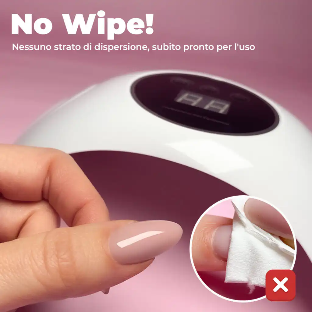Un top coat senza strato di dispersione polimerizza completamente in lampada senza lasciare lo strato appiccicoso. Ciò significa che risparmi tempo prezioso perché le tue unghie non devono essere pulite con il detergente per gel. Basta rimuoverlo dalla lampada e goderti subito le tue unghie perfettamente lucide o opache!