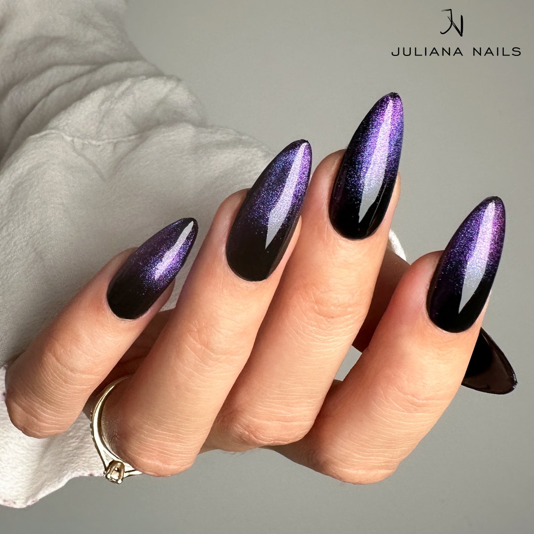 Lo Smalto Gel Cat Eye Astro Kiss ha uno splendido effetto 5D, con riflessi viola, blu e viola contemporaneamente. Puoi ottenere un effetto più intenso su uno sfondo nero.