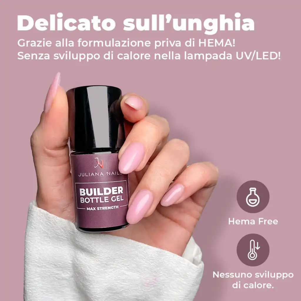 Il Builder Bottle Gel, dopo la polimerizzazione, è molto resistente e minimamente flessibile. Pertanto, può adattarsi solo leggermente ai movimenti naturali dell’unghia naturale. Per evitare rotture, è fondamentale modellare una struttura delghielo. Questa struttura garantisce la stabilità necessaria e previene la rottura della ricostruzione.
